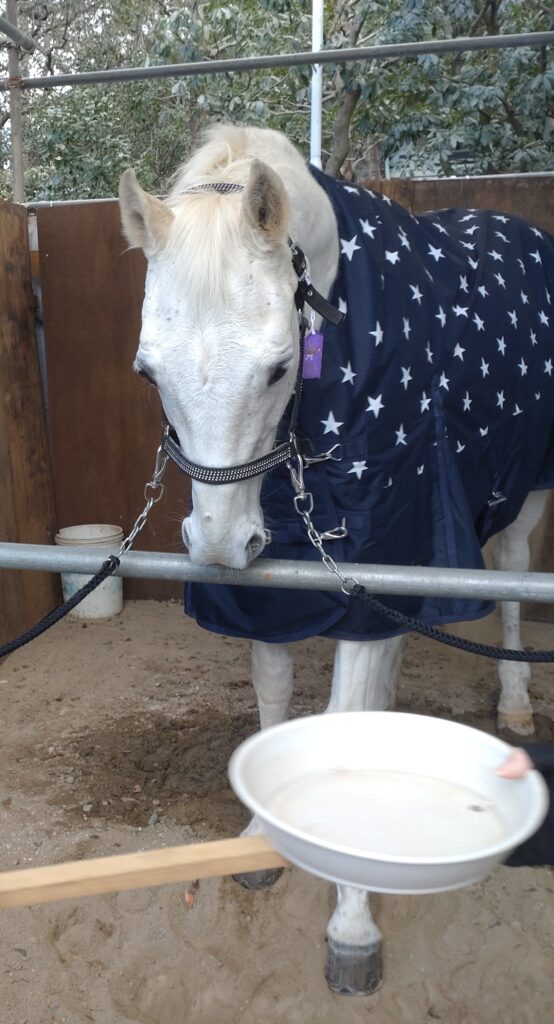 そして、今回の目的の神馬。白い馬に人参を食べさせることができました。人参代は心づくしということで、いくらでも良いようです。写真は人参を食べた後になります。