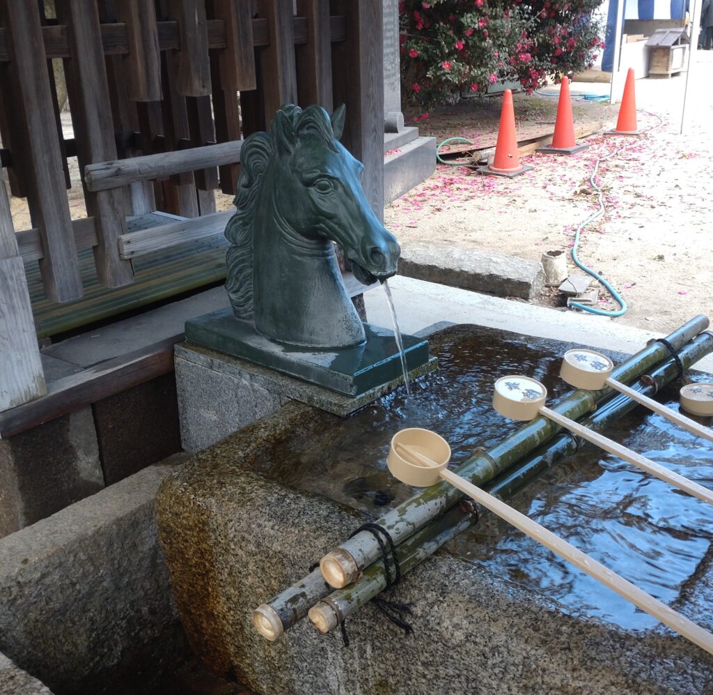 神社の手水舎も馬の口から水が出ています。あちこちに馬がいて面白かったです。